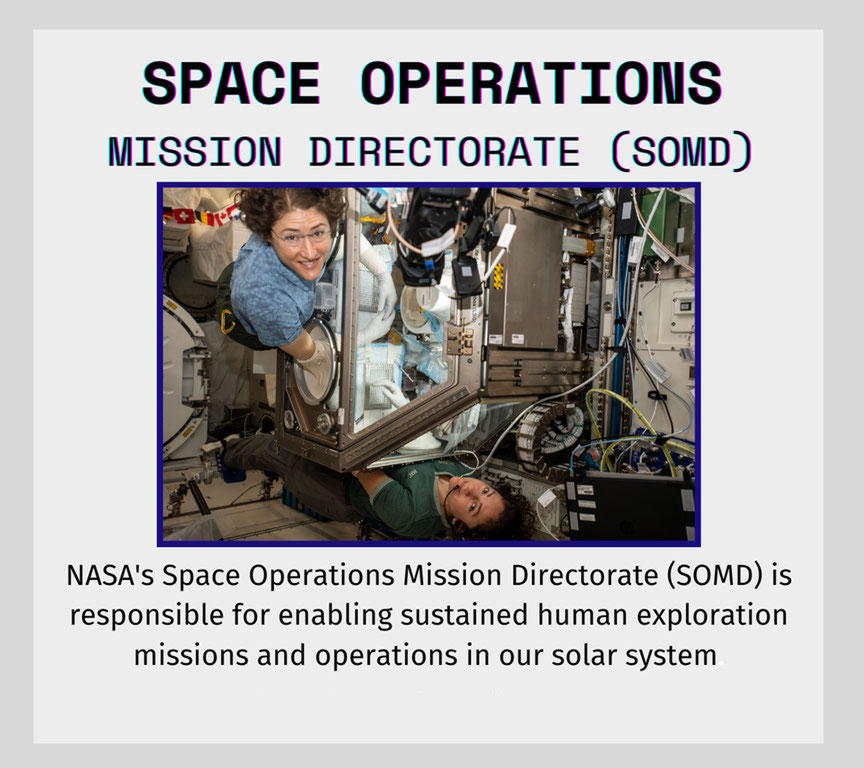 NASA’s Space Operations Mission Directorate (SOMD) is responsible for enabling sustained human exploration missions and operations in our solar system.