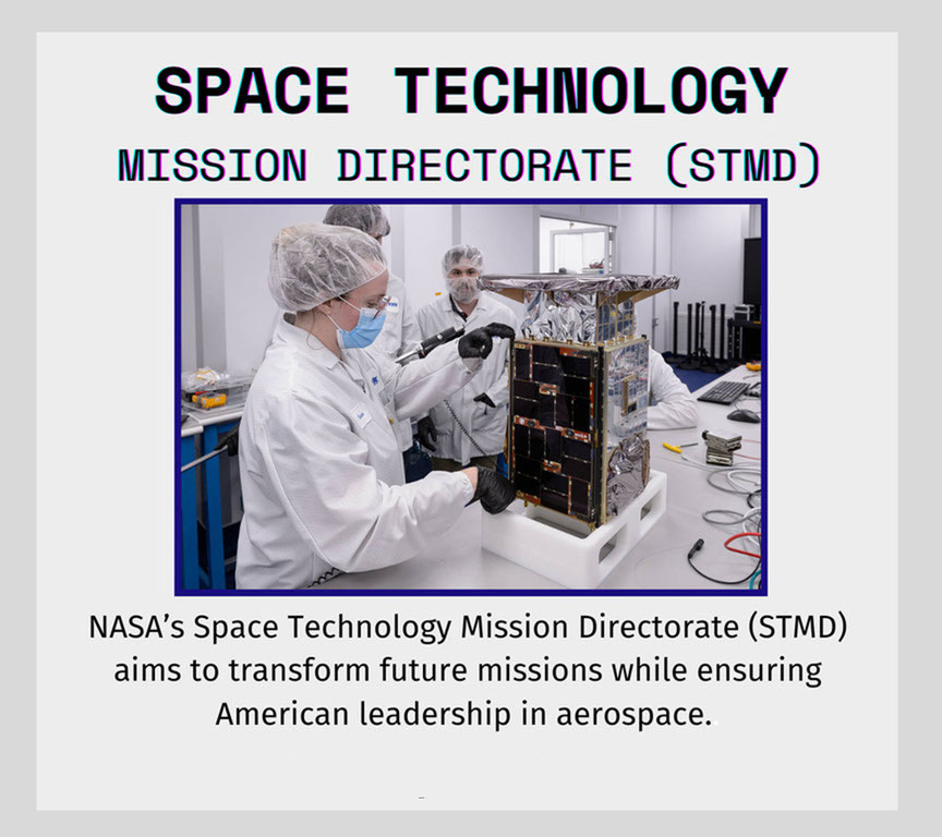 NASA’s Space Technology Mission Directorate (STMD) leads the development, demonstration, and infusion of transformational space technologies that solve critical stakeholder needs and support future NASA, government, and commercial missions. STMD investments aim to (1) advance U.S. space technology innovation and competitiveness in a global context, (2) foster innovation by cultivating breakthrough ideas, embracing risk, and fueling a competitive space economy and (3) inspire and develop a powerful U.S. aerospace technology community to improve life on Earth and in space.