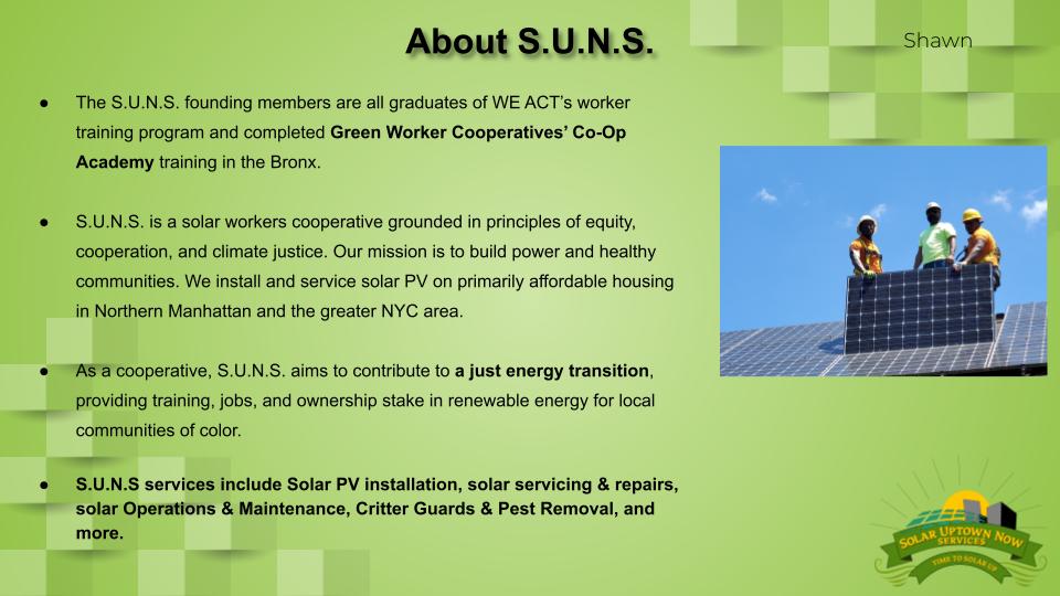 SUNS is the first minority owned and operated for profit, solar installation workers cooperative in New York City.